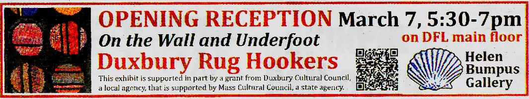 “On the Wall and Underfoot,” the Helen Bumpus Gallery exhibit featuring traditional and contemporary art by Duxbury Rug Hookers opens Monday, March 3, followed by a free opening reception with the artists on Friday, March 7, from 5:30 to 7 p.m.