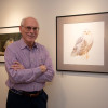 WINGING IT. Photographer Steve Schroeder next to his photo of a snowy owl, on display at the Helen Bumpus Gallery. Schroeder describes himself as “a bird photographer not a birder.” He loves nature and outdoor photography