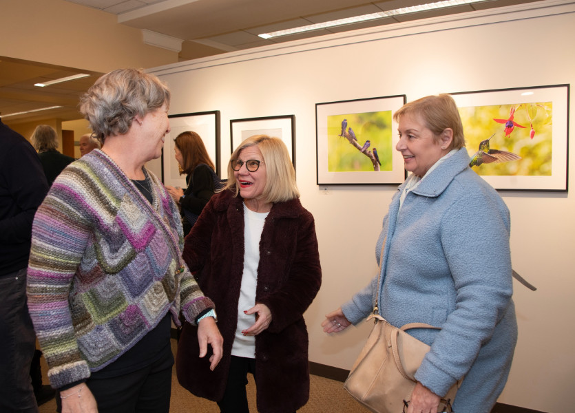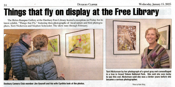 The Helen Bumpus Gallery at the Duxbury Free Library hosted a reception on Friday for its latest exhibit, “Things that Fly,” featuring then photographs of local nature and bird photographers, Terri Nickerson and Stephen Schroeder. The show runs through February. (photos by Karen Wong)